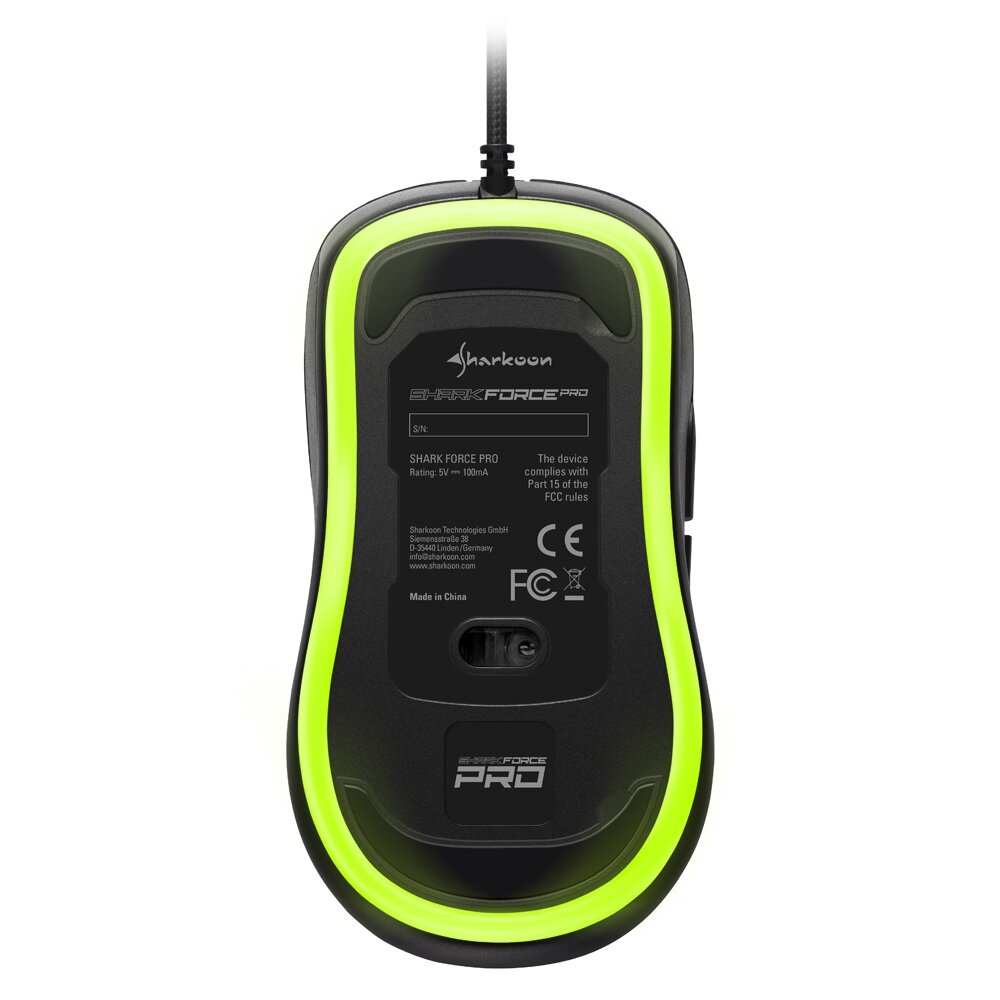 SHARK FORCE PRO имеет, в общей сложности, 6 кнопок мыши: левая и правая кнопки мыши дополнены двумя плоскими легкодоступными кнопками большого пальца, расположенными по бокам мыши. Конечно, колесико прокрутки также кликабельно. С дополнительной кнопкой на поверхности, четырьмя уровнями DPI до 3.200 с возможностью зацикливания. Логотип SHARK FORCE также служит индикатором и загорается для каждого выбранного уровня DPI до максимального значения.
