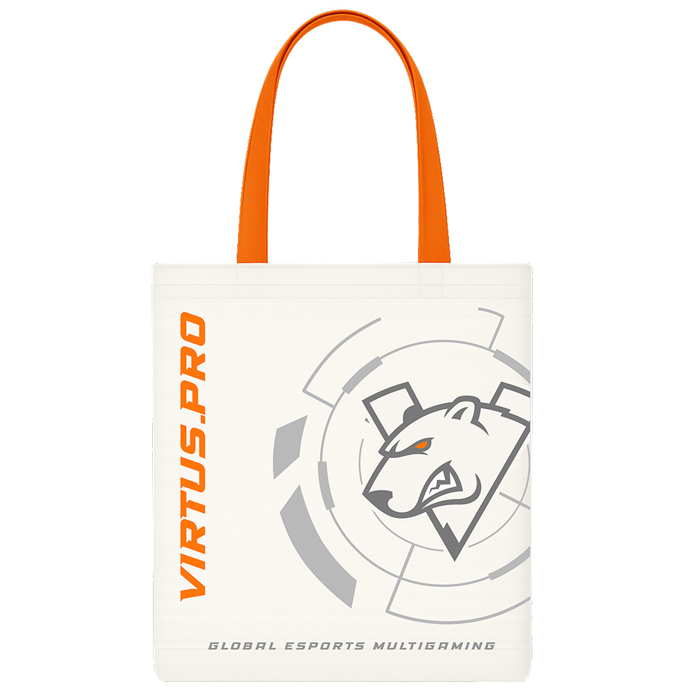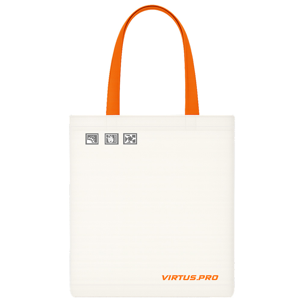 Оранжевые ручки добавляют яркий акцент, делая сумку более заметной и узнаваемой. На обратной стороне внизу также находится надпись "VIRTUS.PRO" оранжевого цвета, а вверху — графические иконки, отражающие тематику киберспорта.