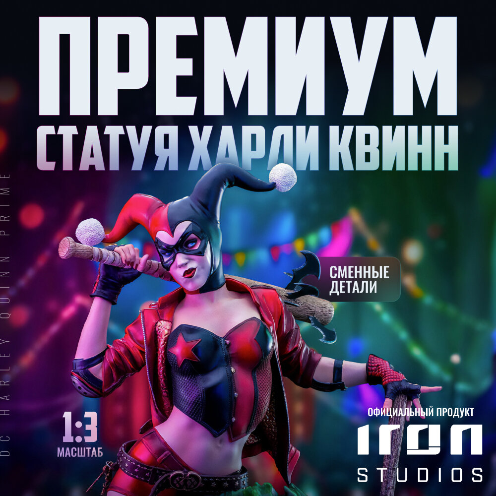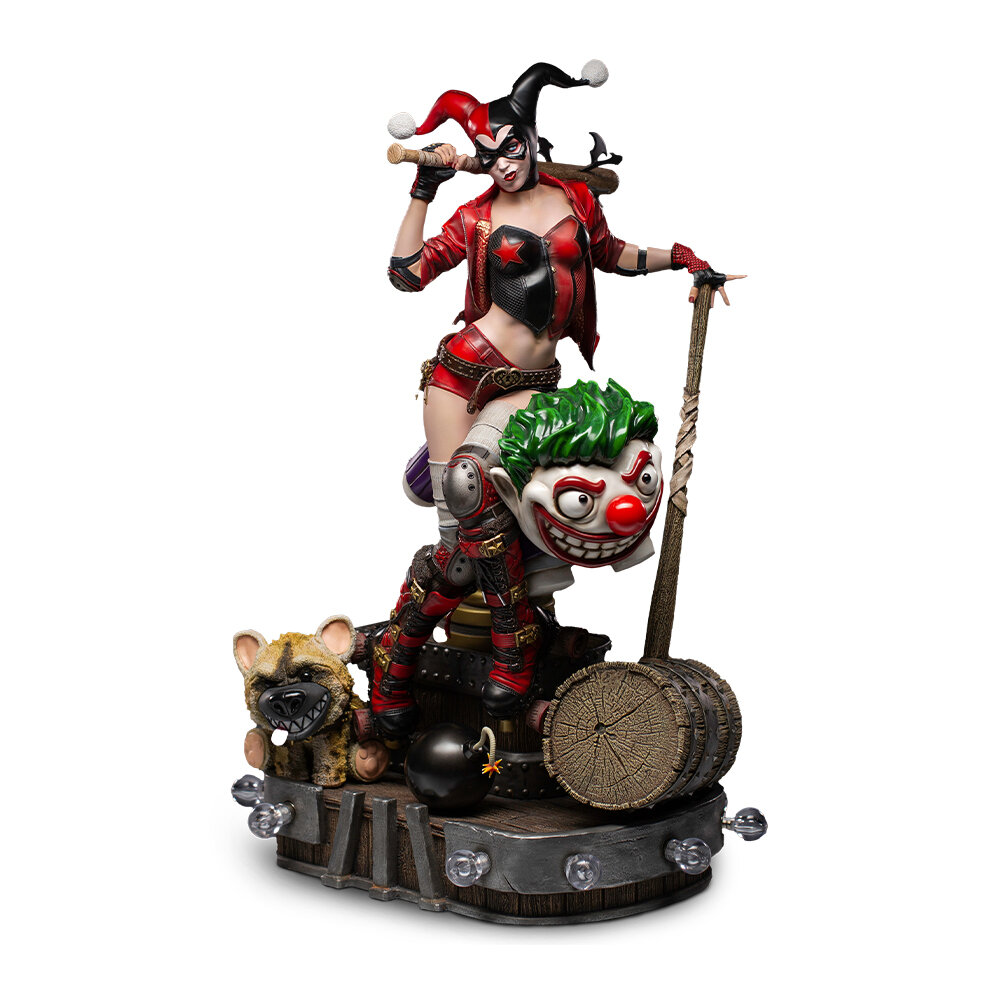 Харизматичная злодейка вселенной DC повторяет свой комиксный образ из DC Rebirth с шортами, корсетом и красной кожанкой. На её ногах роликовые ботинки, а в ногах расположились чучело гиены Брюса и чёрная бомба в виде шара с зажжённым фитилём.