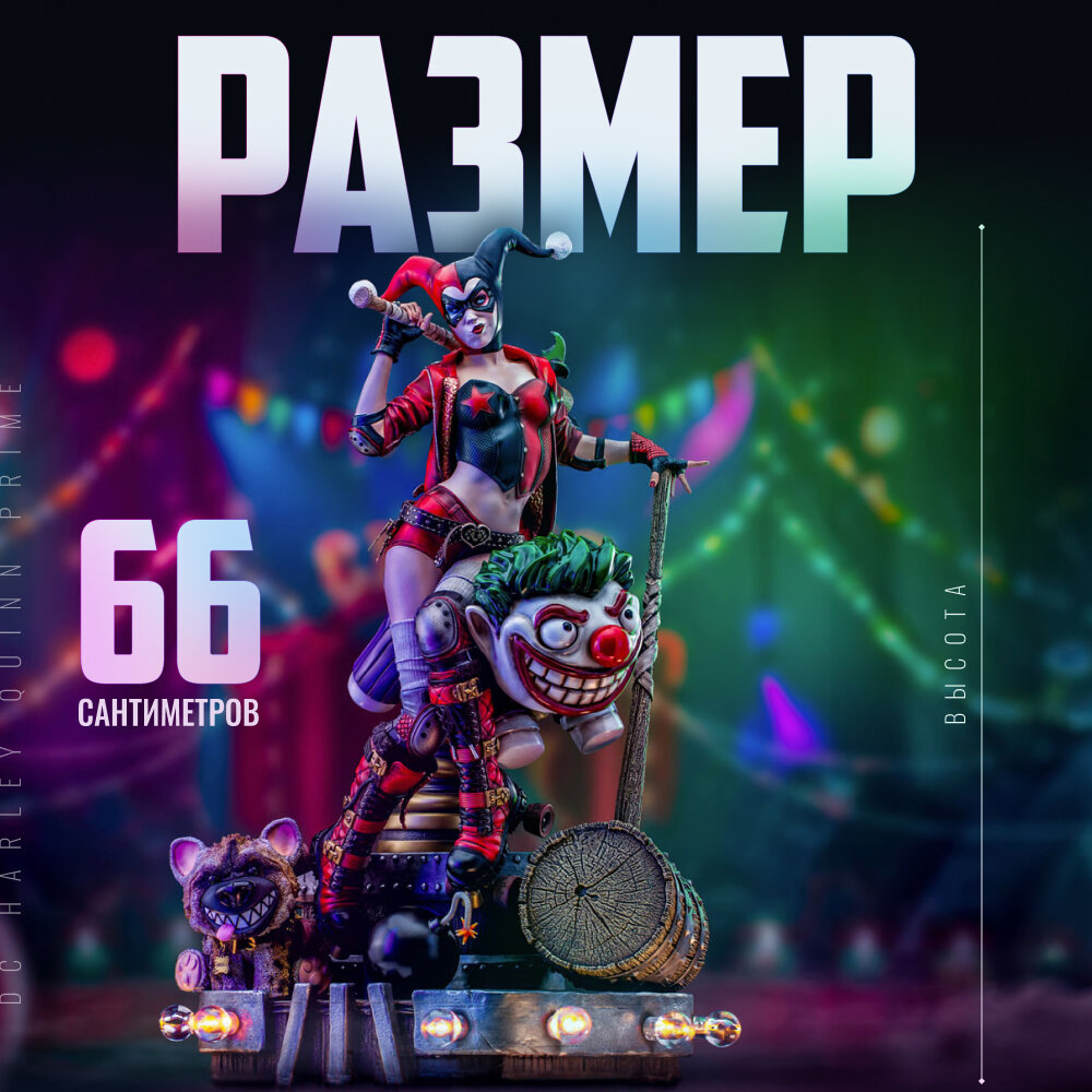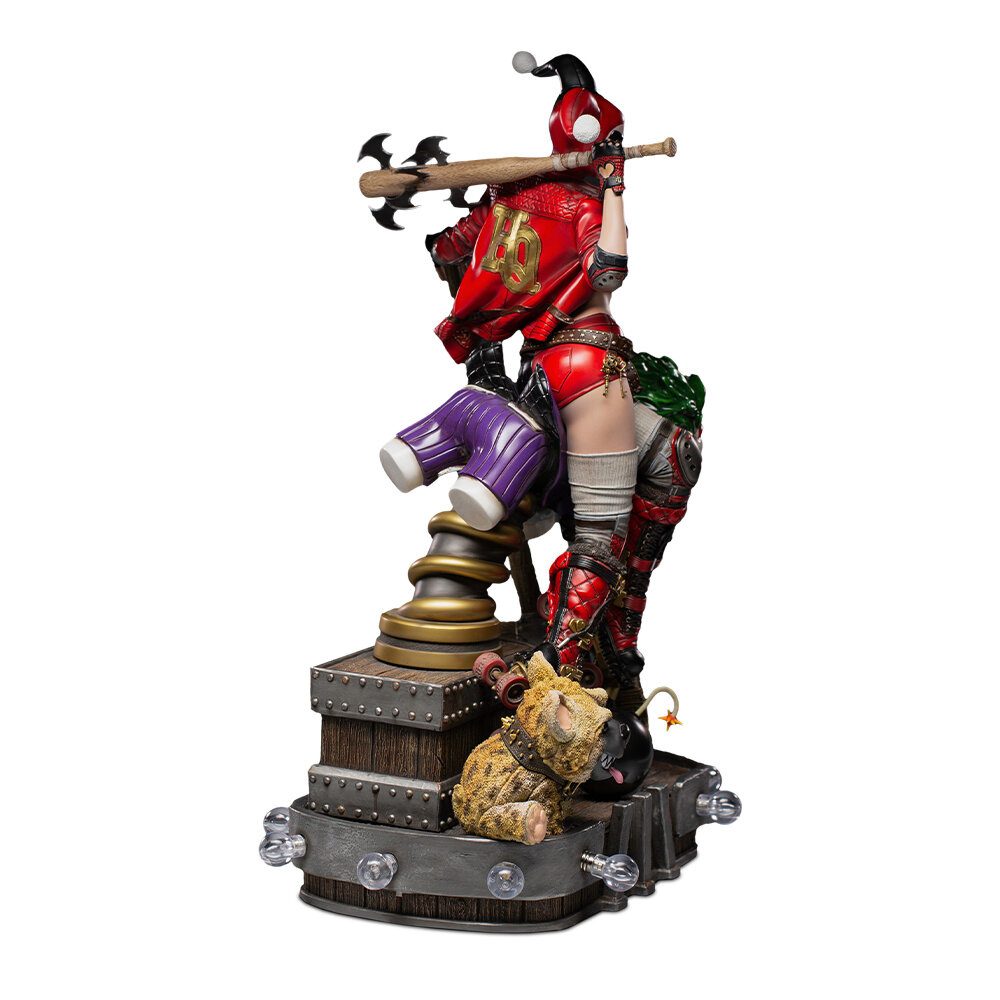 В диораме в стиле старого парка развлечений прекрасная партнерша Принца Клоунов по преступлению позирует, сидя на пружинящей лошадке в форме Джокера, с большим деревянным молотком, на который опирается ее левая рука, а на ее правом плече лежит бейсбольная бита с наконечником, утыканным острыми Бэт-сюрикенами (сувениры Темного Рыцаря) - статуэтка смертоносной Харли Квинн так и притягивает взгляд.