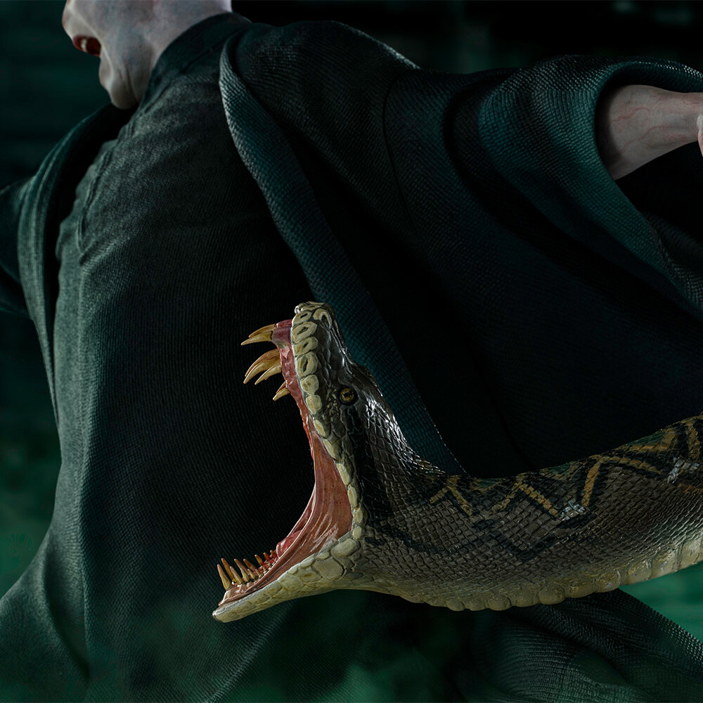 Реалистичность статуэтки выходит на новый уровень, благодаря тщательно воспроизведённым деталям и ручной покраске всей статуэтки. Только посмотрите на эти развевающиеся рукава мантии, чешуйчатую кожу и клыки змеи-крестража, точно воспроизведённым эмоциям на лице статуэтки.