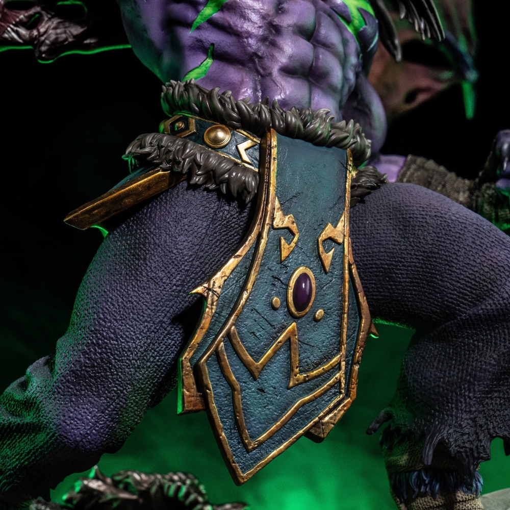Иллидан предстаёт в полном величии: с развевающимися крыльями демона, с парными клинками «Глаивами Аззинота», с пылающими зелёным огнём глазами, скрытыми под повязкой. Его поза — это момент триумфа и вызова: он только что победил Архимонда, но знает, что его путь ещё не окончен. Каждая деталь — от текстуры демонических крыльев до резных узоров на клинках — выполнена с потрясающей точностью, достойной музея Blizzard.