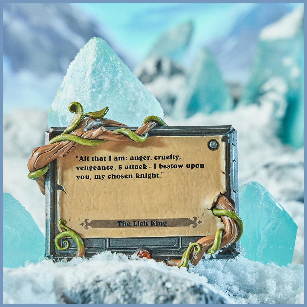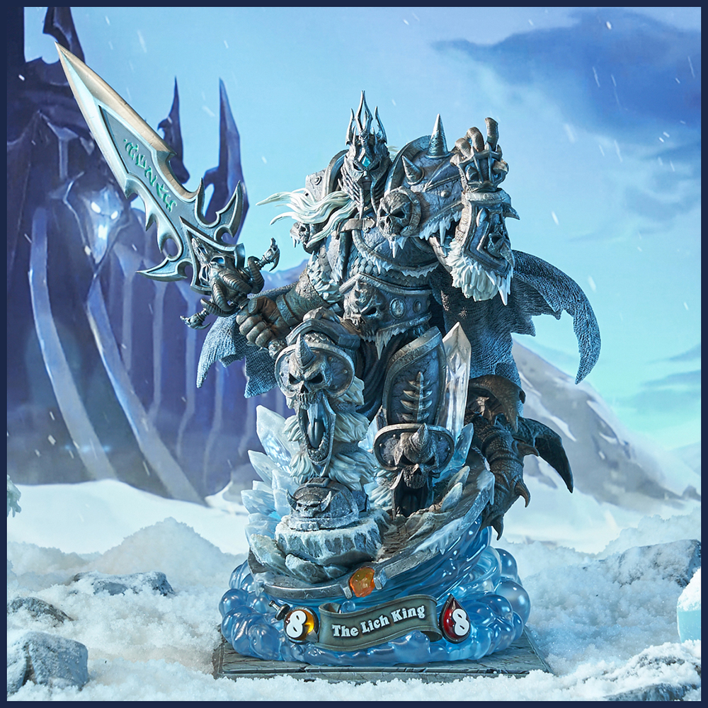 Король-лич восседает на своём ледяном троне, облачённый в доспехи Ледяной Короны, с мечом Фростмуром на коленях — символом его абсолютной власти над нежитью. Его взгляд, скрытый под шлемом, пронизывает насквозь, а вокруг него клубится холодная дымка, будто он только что вышел из карты «Легендарная» в вашей колоде Паладина или Воина. Фигурка передаёт и угрозу, и эпичность, и даже лёгкую иронию — как и сама Hearthstone, где даже апокалипсис может выглядеть стильно и с юмором.