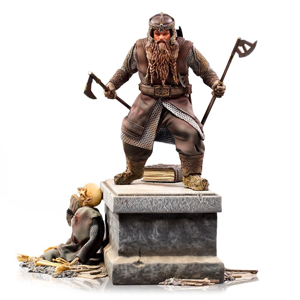 В статуэтке от Iron Studios персонаж "Властелина Колец" Гимли уже принял боевую позу с топорами в руках, чтобы защищаться от орков Мории. Статуэтка с потрясающей аккуратностью воспроизводит мелкие детали этой сцены, начиная с дневника Балина в ногах Гимли, и скелета гнома неподалёку. Статуэтка сделана из полистоуна - искусственного камня, отличающегося прочностью. Все детали Гимли окрашены полностью вручную, а сама статуэтка отличается потрясающей детализацией. Только посмотрите на это исполнение одежды и обуви, реалистичную текстуру железа и камня в статуэтке - всё это отличается удивительной реалистичность. Высота статуэтки, сделанной в масштабе 1/10 составляет 35 сантиметров вместе с основанием.