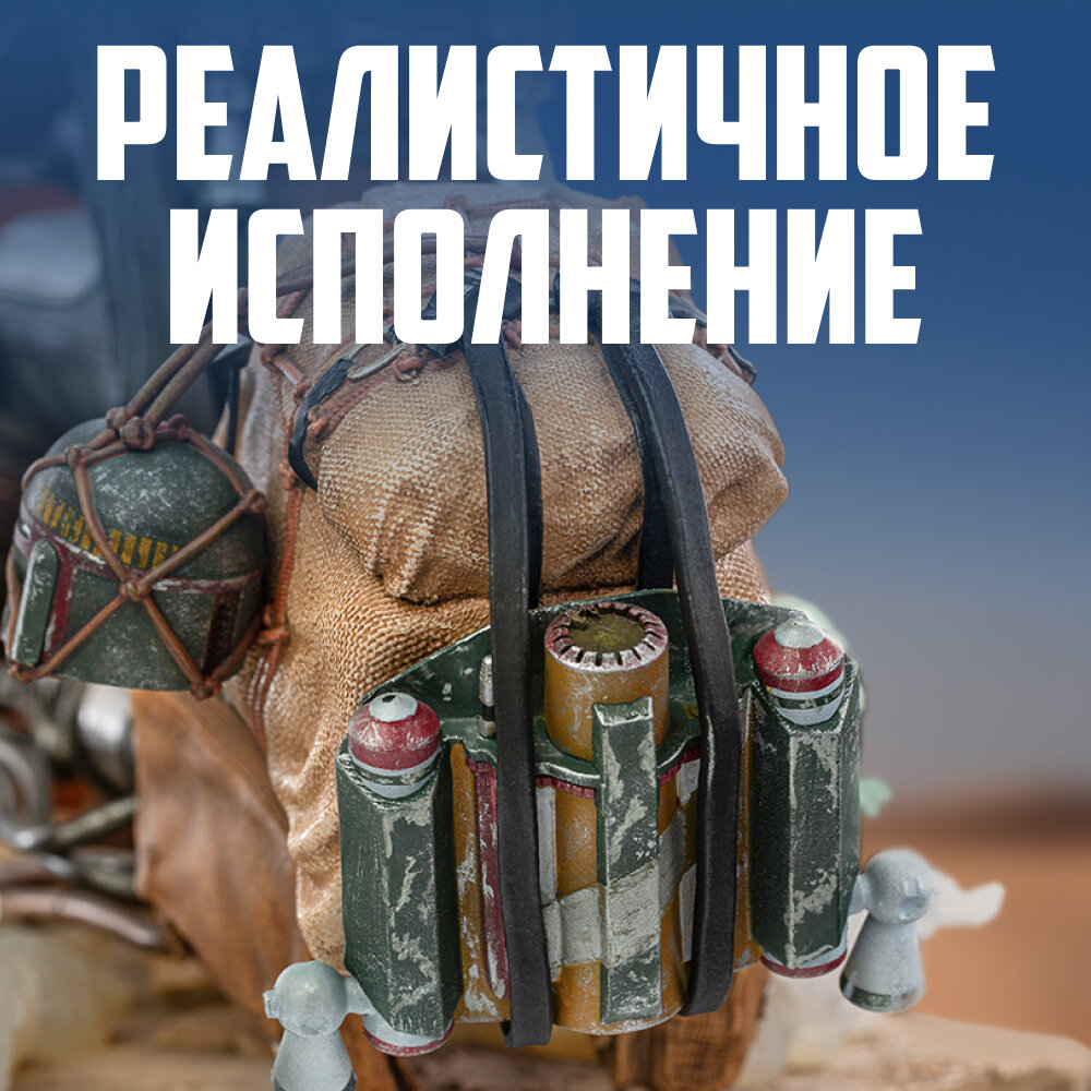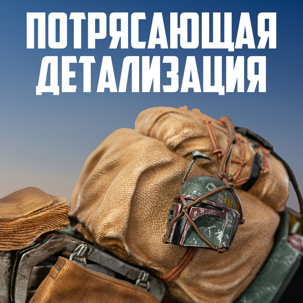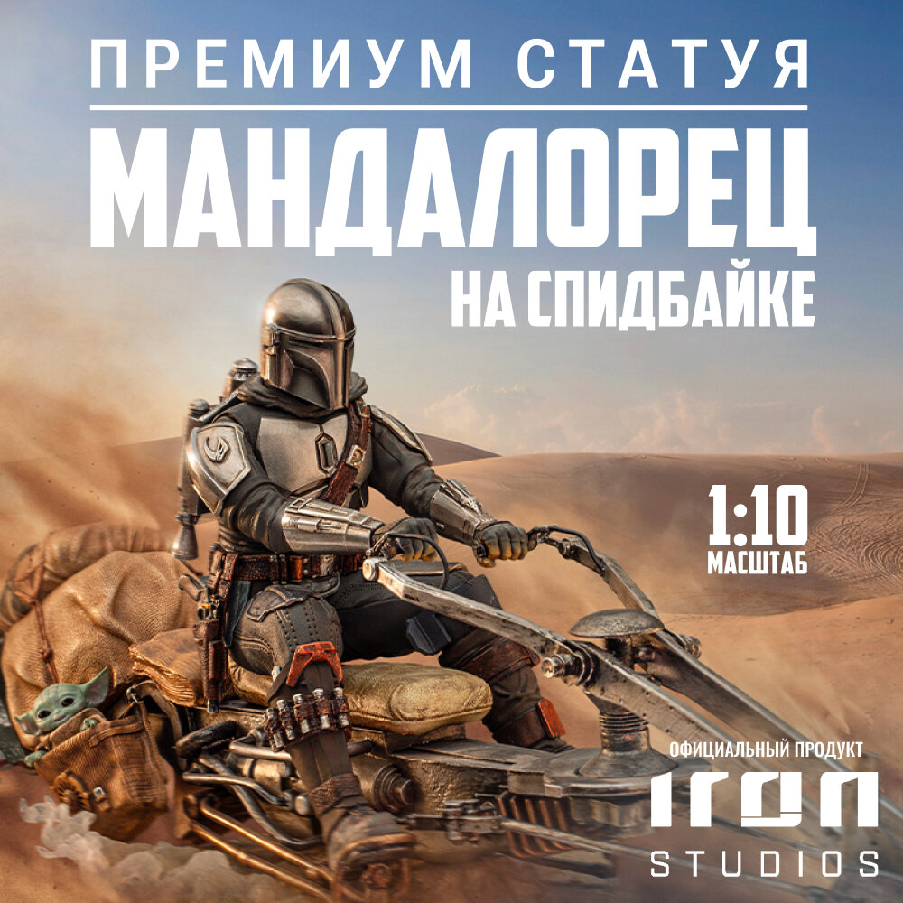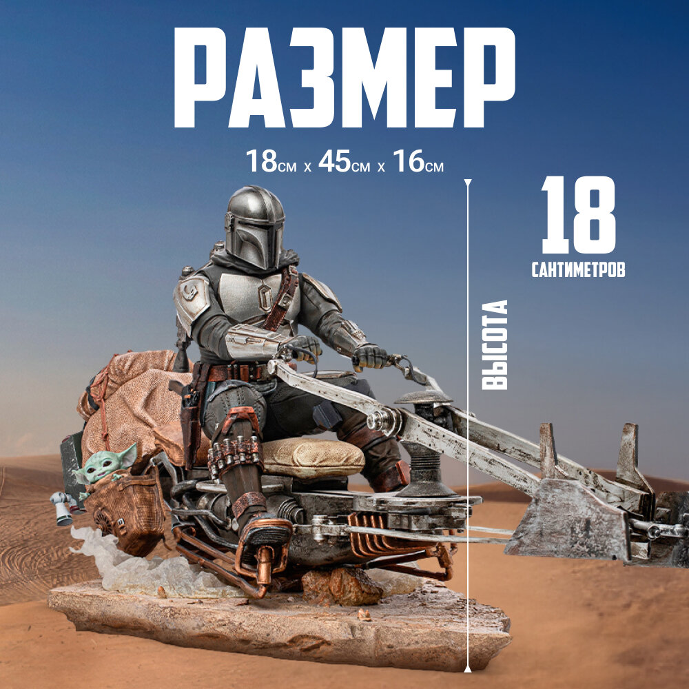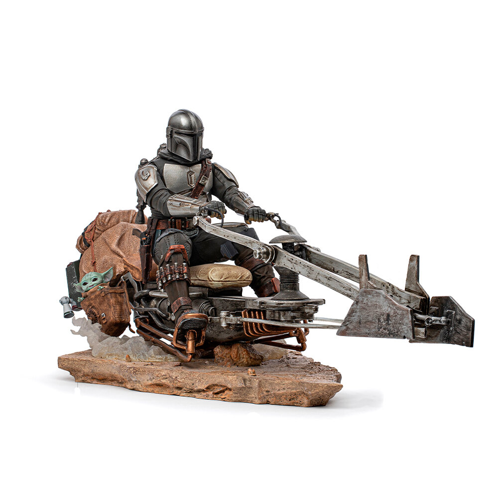 Верхом на спидере поднимая облако пыли мандалорианский охотник за головами пересекает сухую пустыню планеты Татуин. В его рюкзаке сидит маленький Грогу - ребёнок которого защищает Мандо и который видимо наслаждается высокой скоростью. Iron Studios представляет статуэтку вдохновлённую сценой из первого сезона "Мандалорец".