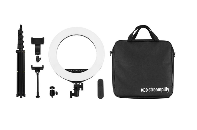 Streamplify LIGHT 14 - это большая кольцевая лампа при помощи которой вы сможете в разы улучшить качество трансляций и видеозаписей. Благодаря своим функциям и дополнительным приспособлениям она вполне подойдет для стримерских студий или для использования дома. У светильника есть 4 разных режима "температуры цвета" и 10 уровней яркости, а также устройство комплектуется штативом-треногой и селфи-палкой для регулировки высоты лампы в пределах от 50 до 170 см. Для управления разными функция лампы у нее есть сенсорная панель и ИК-пульт. С их помощью можно настроить "температуру цвета", а также выбрать яркость свечения в зависимости от окружающих условий. У лампы есть два крепления для камеры и удобный держатель для смартфона, за счет чего вы сможете одновременно пользоваться несколькими устройствами для стримов или записи видео. На задней панели Streamplify LIGHT 14 находятся два отдельных USB-порта для подключения и зарядки смартфона или камеры.