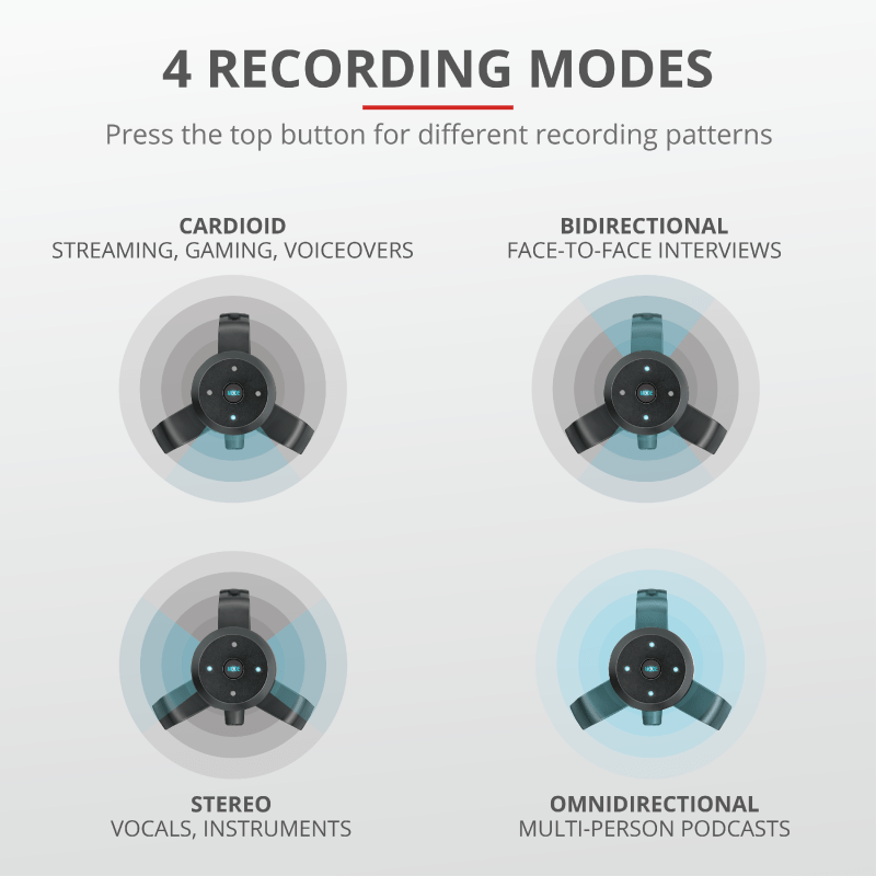 FYRU позволяет вести запись 4 различными способами, оптимизированными для любой ситуации. Используйте кардиоид, если вы хотите получить четкую запись без фоновых шумов - идеально для подкастов от одного человека. Выбирайте двунаправленную передачу, если вы записываете дуэт или проводите интервью. Стерео - это шаблон, который можно использовать для записи стереофонической музыки, или вы можете захватывать все окружающие звуки с помощью всенаправленного шаблона, что идеально подходит, если вы ведете групповой подкаст.