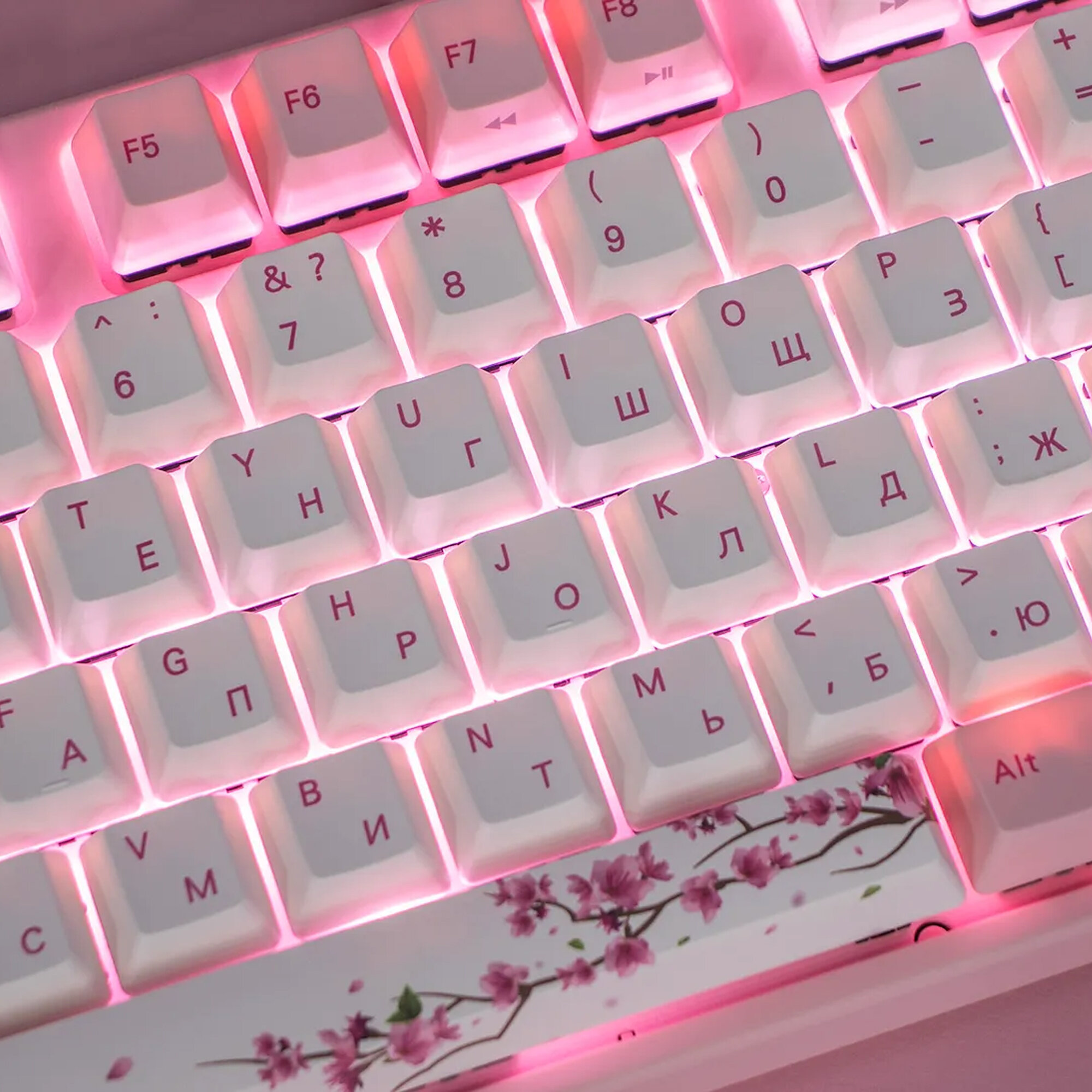 Кейкапы Varmilo Sakura R1 VEA87 изготовлены из PBT пластика, а это значит что они очень приятные на ощупь и гораздо более устойчивые к истиранию, чем кейкапы изготовленные из других видов пластиков.