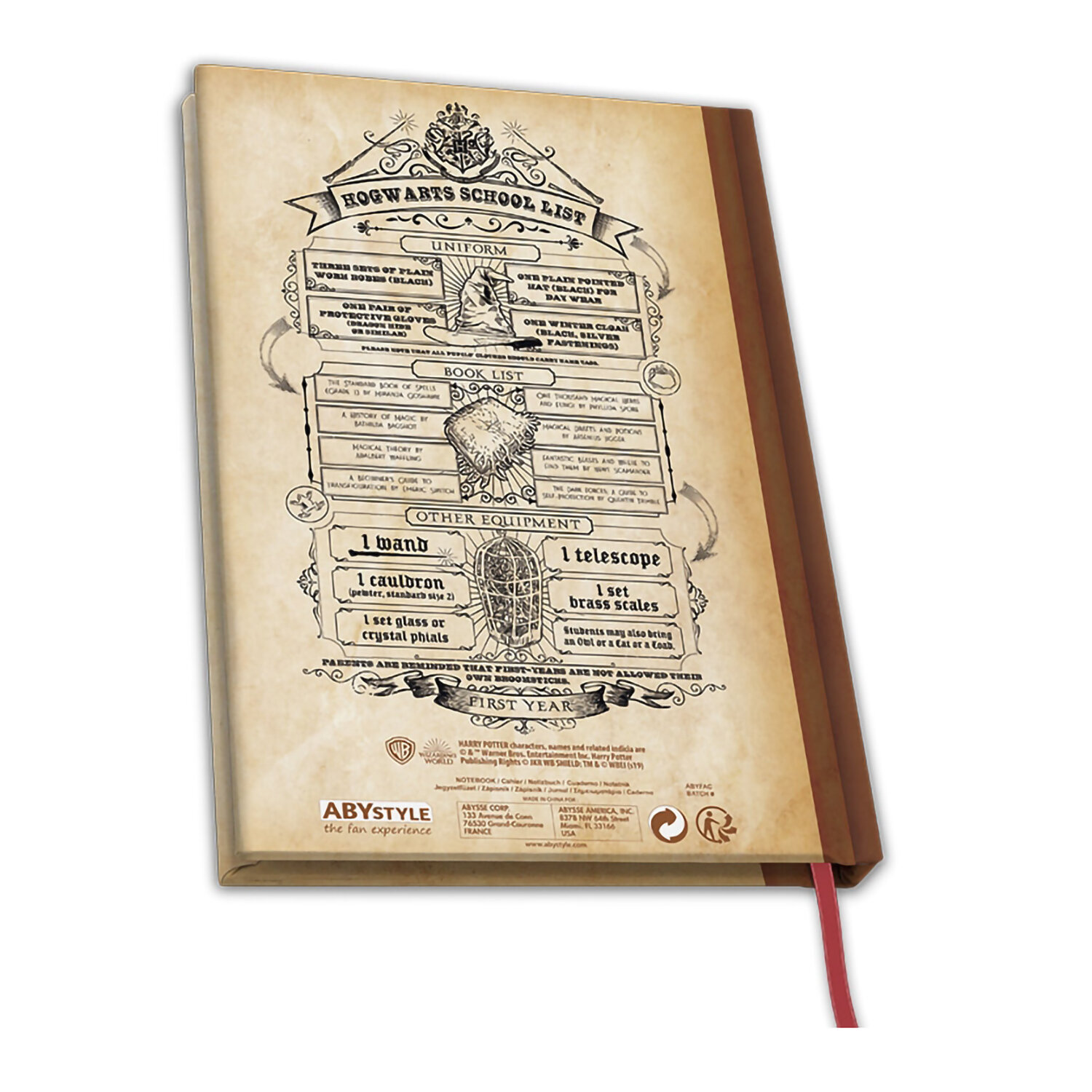 1 палочка, 1 котел (оловянный, стандартный размер 2), 1 набор стеклянных или хрустальных фиалов и эта записная книжка от ABYstyle. Теперь у вас есть все, что нужно для успешного года в Хогвартсе! Твердая обложка, матовая отделка с точечным лаком. Внутри печать высокого качества. Переплет в виде футляра и закладка.